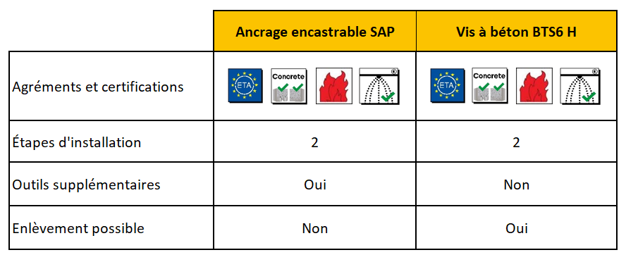 Dans l'ensemble, la vis à béton constitue la meilleure alternative, lorsque cela est possible, à l'utilisation d'un ancrage à encastrer, réduisant considérablement le temps d'installation et la fatigue lors de l'installation en hauteur sur béton.